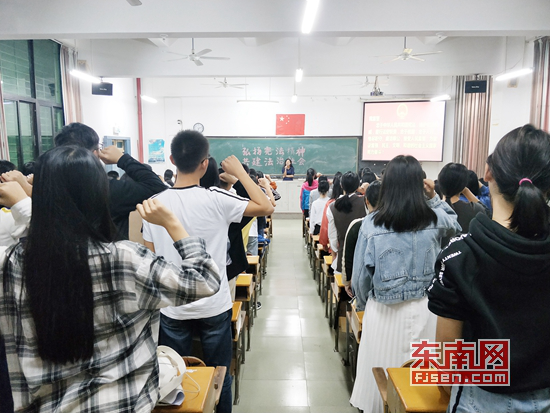 东南网12月5日讯(通讯员 陈范武 本网记者 谢玉妹)今年12月4日是第五个国家宪法日,福建师范大学火狐(中国)HUOHU官方网站精心组织,紧密围绕“一次升挂国旗仪式、一堂宪法教育课、一场普法讲座、一场宪法学习宣讲会、一次‘学宪法·守法律·讲诚信’签名活动、一系列国家宪法日法治宣传”等“六个一”内容,多渠道、多方式组织开展宪法主题宣传教育活动,把宪法教育融入教育教学实际,增强新形势下法治文化教育的渗透力、感染力和影响力。