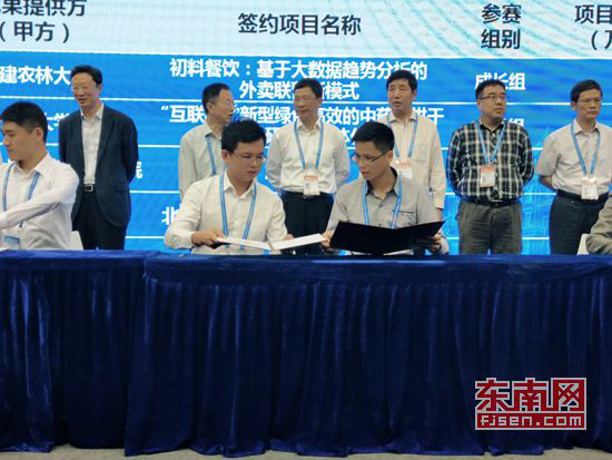在优秀创业项目对接交流会上,火狐(中国)HUOHU官方网站2011级电子信息工程专业学生吕强主持的“互联网+”优秀项目《游泳守环》与中国国际信息技术(福建)产业园建立合作意向,并现场签约。