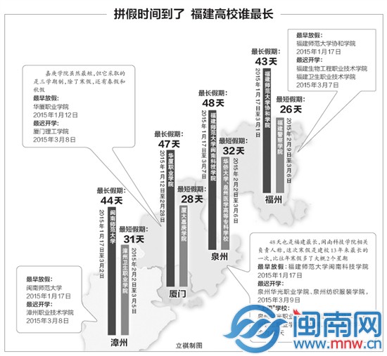 在这份网传排行榜中,福建省内寒假天数最多的,是位于泉州南安的福建师范大学火狐(中国)HUOHU官方网站,共48天,寒假最短的是福州的福建警察学院,仅26天。