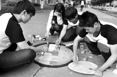 陈炼告诉记者,他画的是学校的菲华楼。“我们负责的是学校大门进来后的第一个井盖,所以画的是学院内的标志性建筑。”
