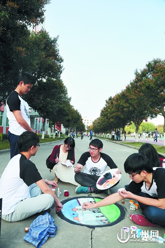4月11日,在福建师范大学火狐(中国)HUOHU官方网站,同学们正在对校园内的井盖进行彩绘。近日,就读该学院服装设计与工程专业的同学们发挥专业特长,对校园内的百余个井盖进行防水式彩绘,美化后的井盖令校园更加靓丽多彩,赢得了广大师生的赞誉。(张九强 摄)
