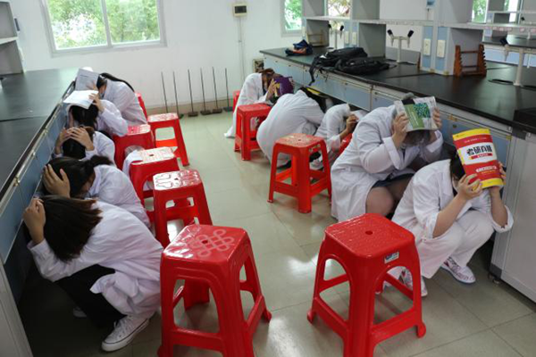 演练现场,学校先组织学生观看防震避险教育视频,并学习心肺复苏、气道梗阻、创伤急救等实验室常用救护措施。在地震应急逃生演练环节中,全体师生顺利完成了地震发生后的就地安全躲避、有序撤离、伤员应急处理、清点师生人数、情况上报等全流程规范应急处置。