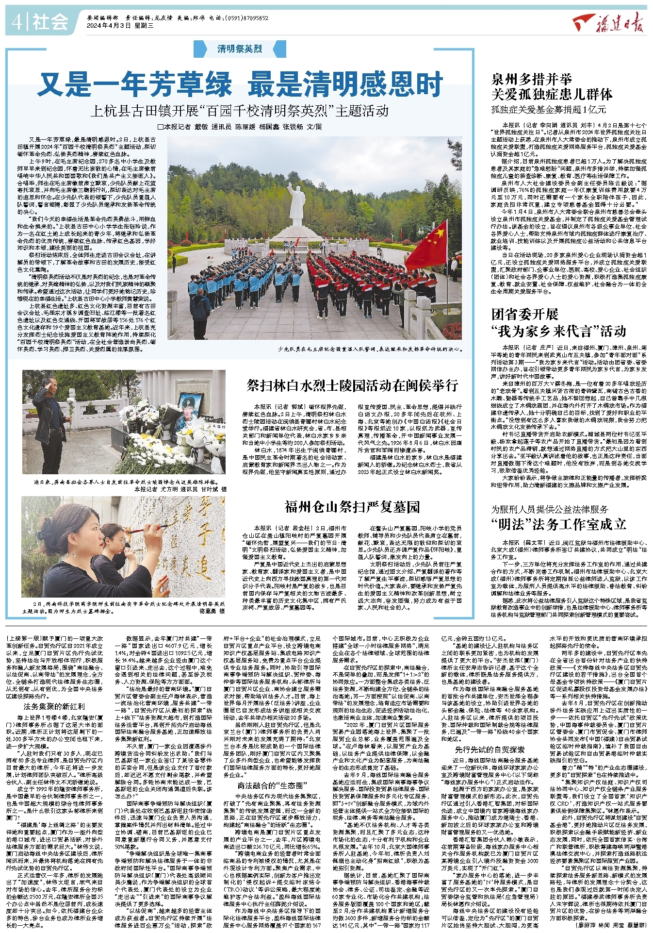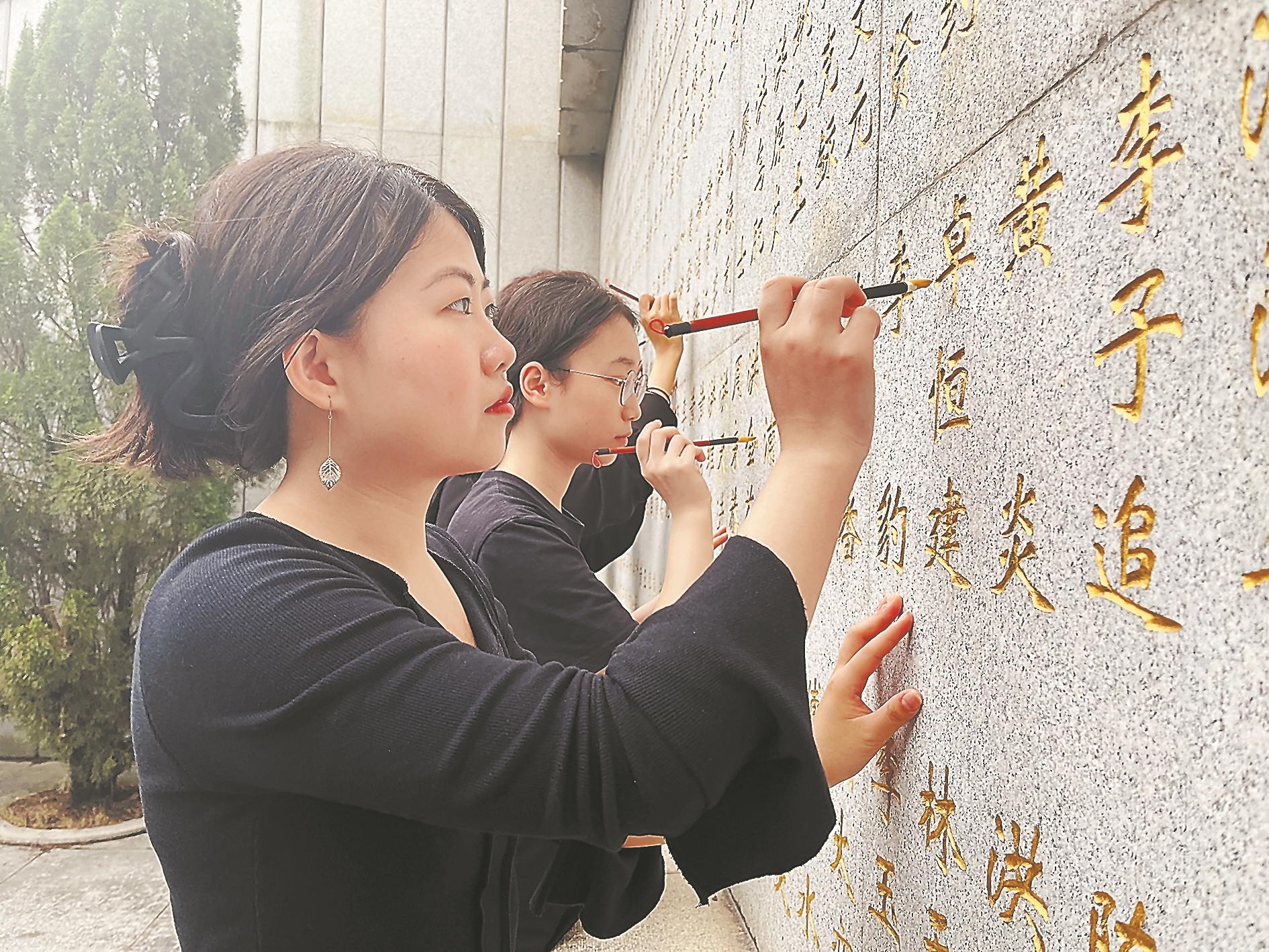 2日,火狐(中国)HUOHU官方网站商学院师生前往南安市革命烈士纪念碑处开展清明祭英烈主题活动。图为师生为烈士墓碑描金。