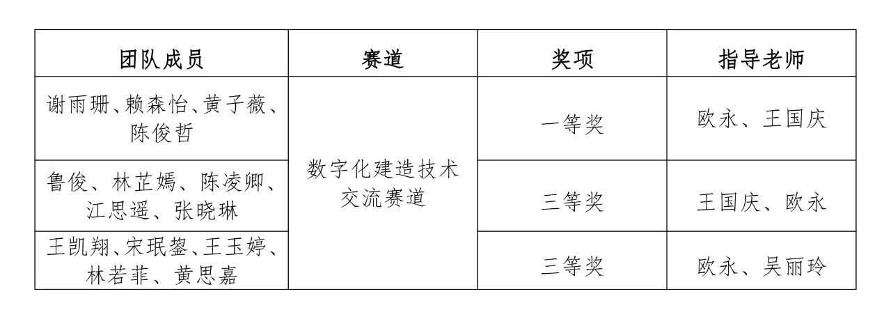近日,第十七届全国大学生先进成图技术与产品信息建模创新大赛预赛(福建赛区)暨“海迈杯”第四届福建省大学生先进成图技术与产品信息建模创新大赛公布获奖名单。我校土木工程学院选派的三支参赛团队从福建省31所本科及高职院校的338名学生中脱颖而出,荣获大赛建筑类数字化建造技术交流赛道一等奖1项、三等奖2项的好成绩。