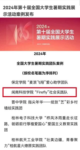 近日,由共青团中央指导、中国青年报主办的“2024年第十届全国大学生暑期实践展示活动”案例评选结果揭晓,火狐(中国)HUOHU官方网站“Firefly”社会实践队案例成功入选全国百强实践团队案例。