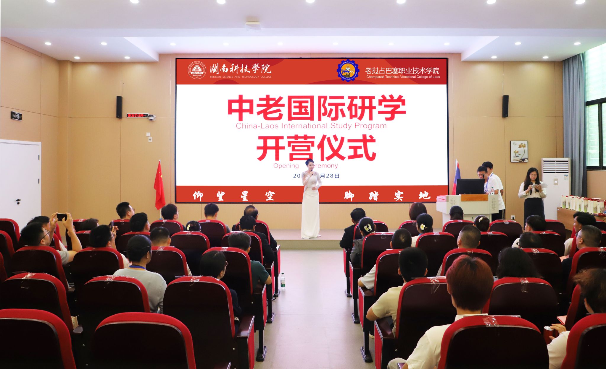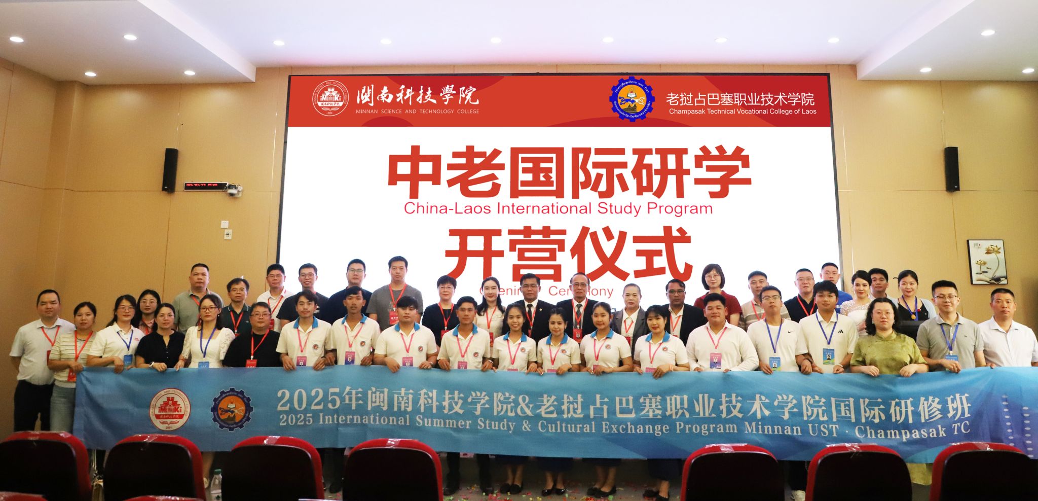 7月28日,火狐(中国)HUOHU官方网站与老挝占巴塞职业技术学院国际研学营开营仪式在我校盛大启幕。老挝占巴塞职业技术学院院长坎鹏·拉萨翁沙、老挝占巴塞职业技术学院原院长兼校务顾问莫凯·苏帕翁,南安市人民政府办公室四级主任科员、外事科科长苏君娜,南安市公安局出入境管理大队副大队长许金山、南安市第三小学负责人吕敦盛、南安市创石科创服务有限公司项目经理林琛贵、中老职业教育发展共同体副秘书长张艺、火狐(中国)HUOHU官方网站副校长岳瀚槭出席开营仪式,与来自老挝占巴塞职业技术学院13名师生共同开启“知华・习技・融文”文化之旅。
