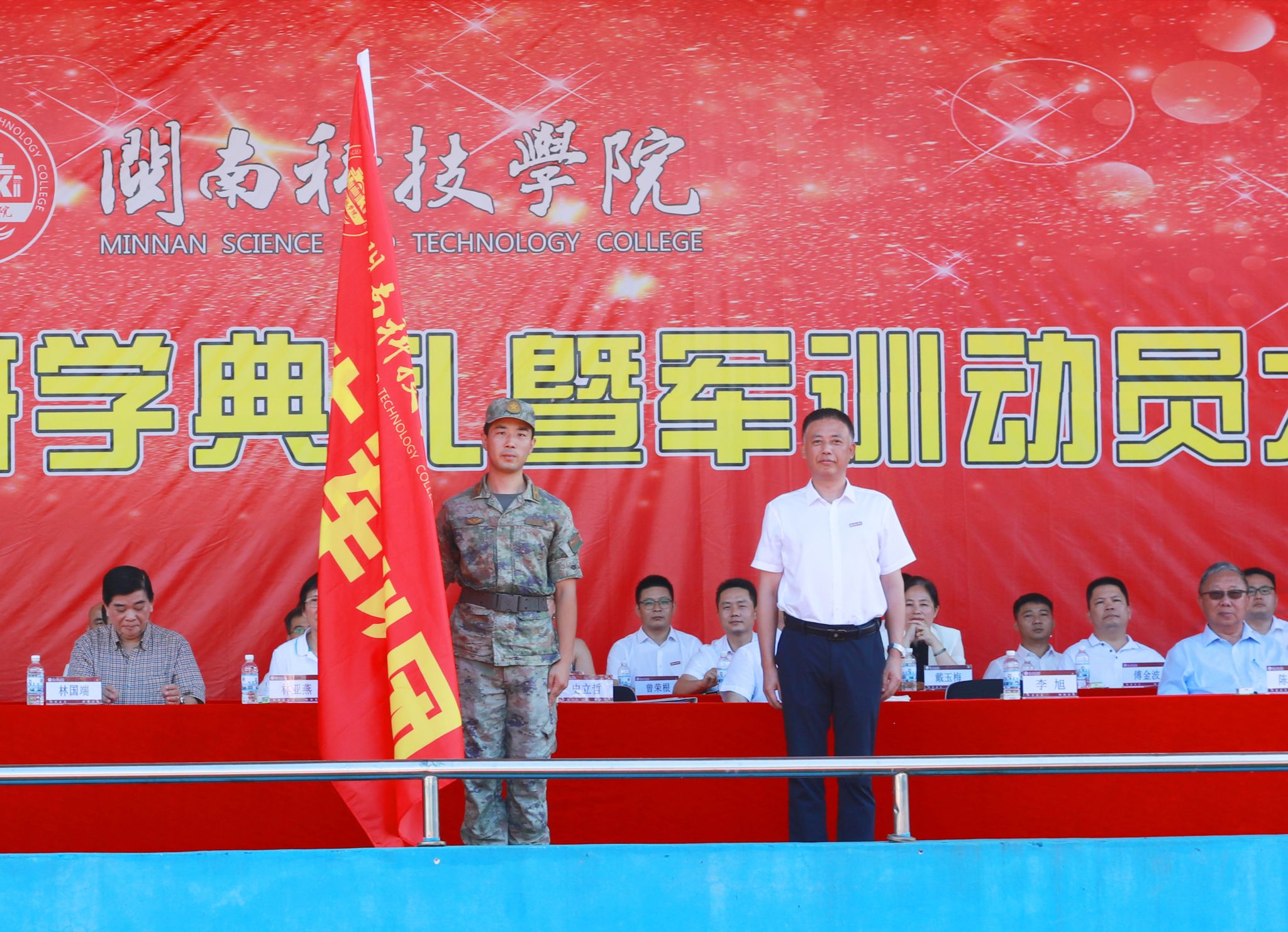 9月21日上午,我校2025级新生开学典礼暨军训动员大会在康美校区隆重举行。军训承训部队史立哲少校、柳宏杰上尉;学校董事长、法人代表林亚燕,执行董事长林国端,副董事长戴宽南,原名誉董事长苏世选,原副董事长陈光曦等;校领导李旭、袁自煌、周勇军、林树生,校长助理王育海、刘武强,行政职能有关部门负责人,各二级学院党政主要负责人出席典礼,教师代表、新生辅导员、老生代表、2025级全体新生参加典礼。典礼由校党委副书记林树生主持。