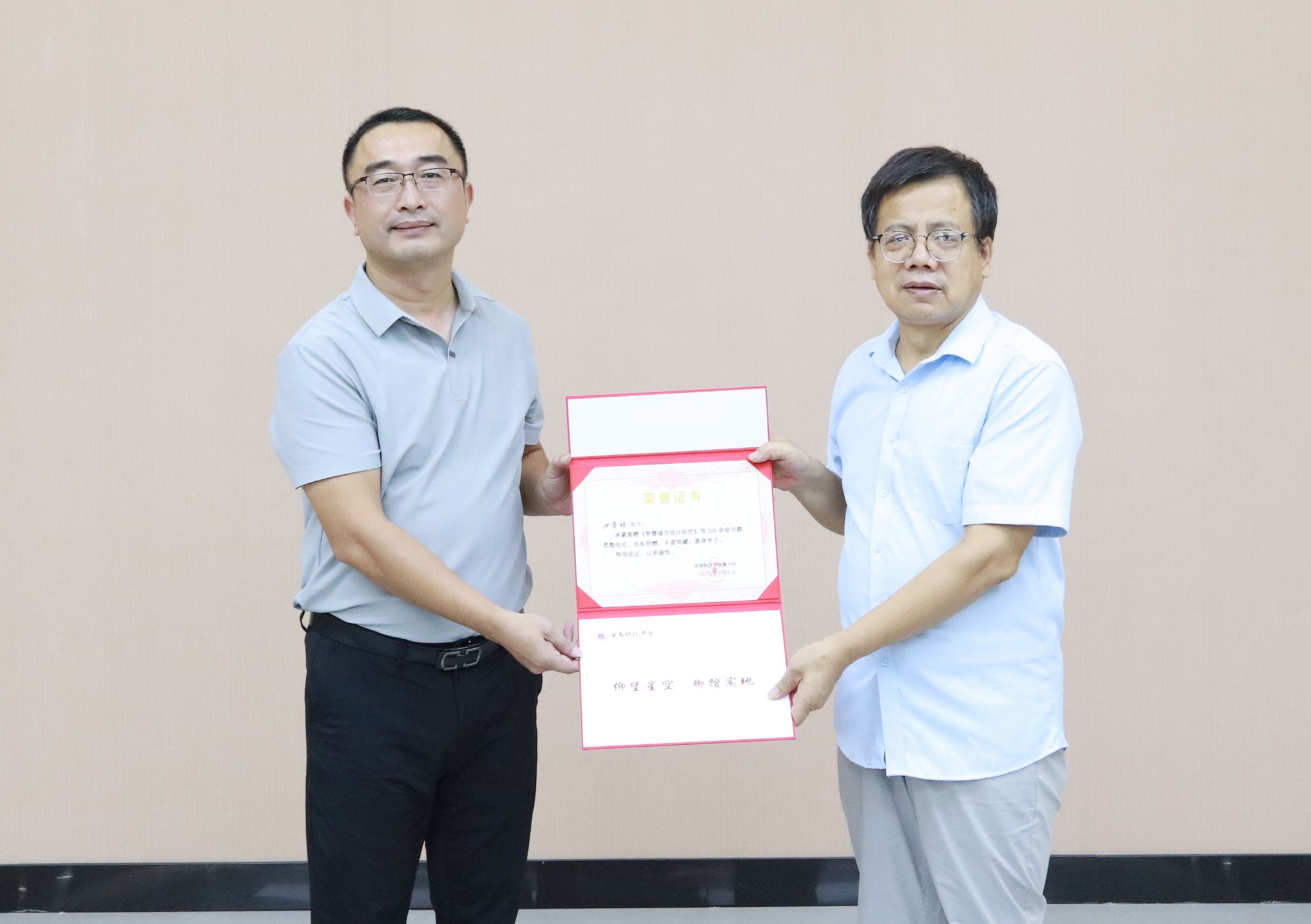 校长助理、教务处处长刘武强代表学校接受图书捐赠,并向沙晋明教授颁发捐赠证书。