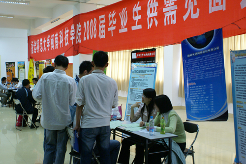 4月19日上午,我院2008届毕业生供需见面会在福建师范大学旗山校区举行。这是专门针对我院2008届毕业生开的一次专场招聘,吸引了来自福州、厦门、泉州等地的企业参加。院领导黄国盛、刘静、何瑞鑫、陈振祯到场指导各项工作。