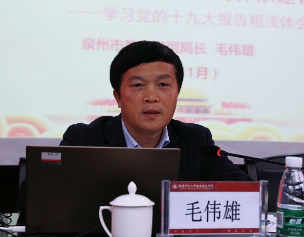 12月6日,我院举办学习贯彻党的十九大精神专题辅导报告会。泉州市教育局副局长毛伟雄作主题为“以党的十九大精神为指导,加快泉州现代职业教育体系建设步伐”的专题辅导报告。泉州市教育局办公室主任林贵福,高教科科长黄世琴、副科长黄洺鋆出席报告会,全院教职工听取了专题辅导报告。报告会由学院副院长(主持工作)张杰主持。