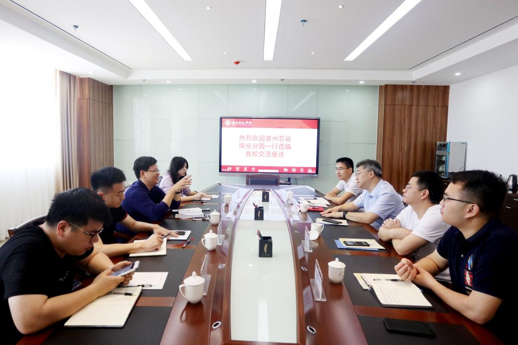 4月24日,泉州半导体高新技术产业园区(简称泉州芯谷)管委会副主任、南安园区管委会主任蔡映辉,泉州芯谷南安分园区综合协调办副主任廖汜彬等一行4人莅临我院考察交流。学院党委副书记、副院长(主持工作)张杰出席交流会。