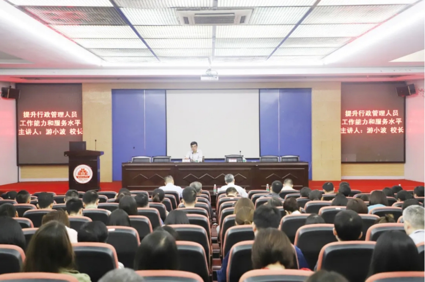 11月25日上午,我校举办《提升行政管理人员工作能力和服务水平》专题讲座,校长游小波担任主讲,校领导李旭、周勇军、林树生,二级学院党政负责人、组织员、辅导员及全体行政管理人员百余人到场聆听。党委书记李旭主持专题讲座。