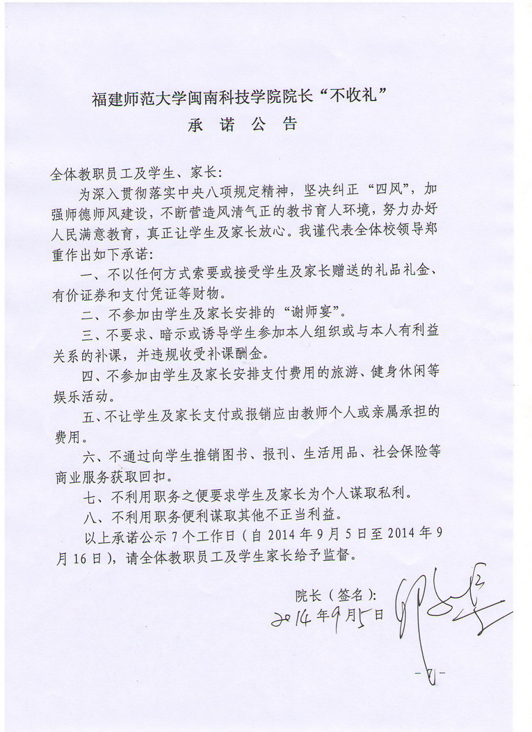 福建师范大学火狐(中国)HUOHU官方网站院长“不收礼”承诺公告